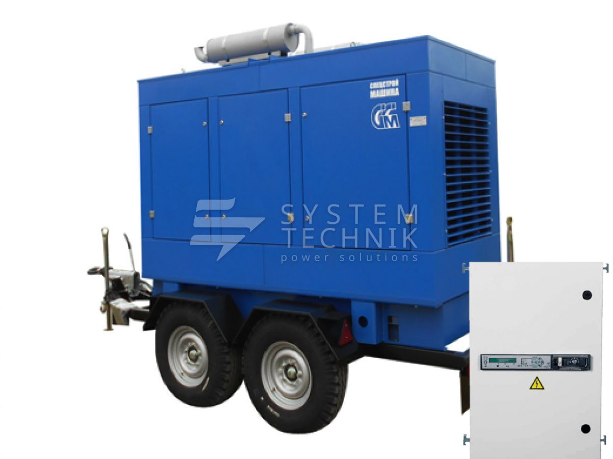 - ССМ ЭД-75-Т400-2РПМ2 (Marelli) в погодозащитном кожухе на шасси с АВР на прицепе